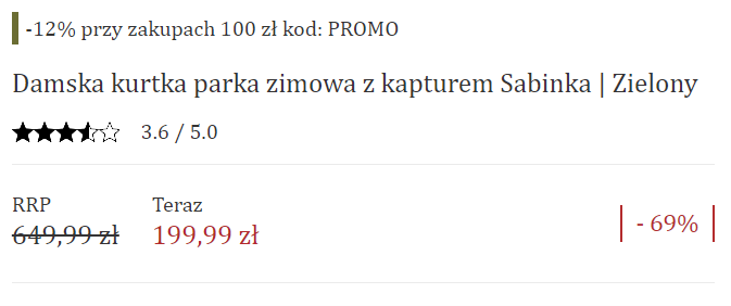 Taki opis nie wydaje się niezbędny w poniższym przykładzie, krytykowanym przez UOKiK z uwagi na „Obliczanie wielkości obniżki (np. 20%, 150 zł) w odniesieniu do ostatniej lub standardowej ceny towaru, a nie najniższej ceny z ostatnich 30 dni”.