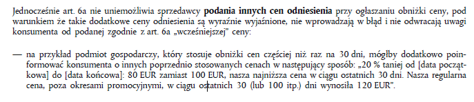 Polski przepis mówi w sposób równoważny o informowaniu o cenie nowej i starej – trudno doszukać się w nim wymogu opisania przekreślonej ceny jako najniższej ceny z 30 dni przed obniżką.