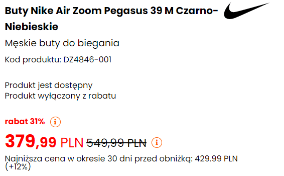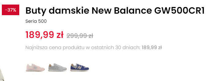 Na bliskim mi przykładzie butów biegowych. Czasami przy okazji wpadam do sklepu, mierzę jakieś buty i czekam na lepsze ceny. No bo po pewnym czasie spadają o kilkadziesiąt procent. Mój ulubiony sklep może zrobić kilkudniową promkę z okazji Mikołajek lub innej, po której cena wróci do regularnej na kilka tygodni i kolejna obniżka ma miejsce po Świętach. W takim przypadku komunikacja sklepu jak niżej jest korzystna dla klienta, bo pokazuję skalę korzyści w stosunku do ceny pierwotnej – a jednocześnie informuje jakie były promocje w ostatnim czasie.